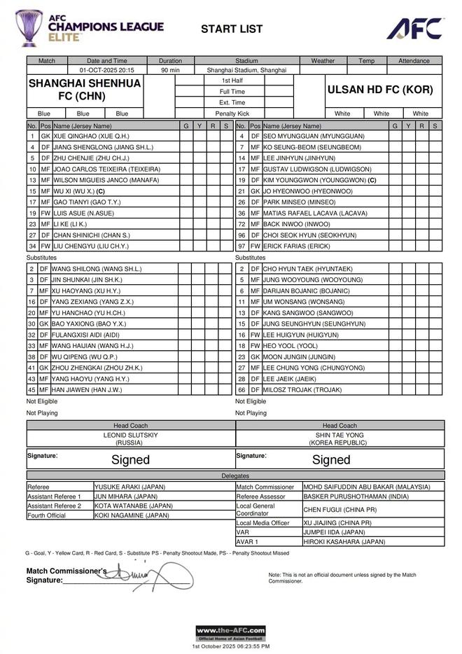 10月1日晚,在2025/26赛季亚冠精英联赛第2轮中,中超豪门上海申花坐镇主场上海体育场,迎战韩国K联赛劲旅蔚山HD。赛前,两队首发名单公布。