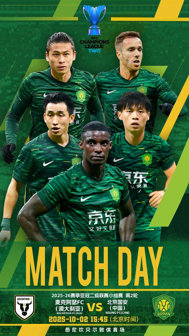 2025-26赛季亚冠二级联赛小组赛 第2轮麦克阿瑟(澳大利亚)VS北京国安(中国)2025.10.02 15:45(北京时间)悉尼坎贝尔敦体育场
