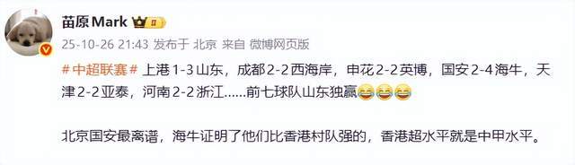 足球记者苗原老师则表示,“上港1-3山东,成都2-2西海岸,申花2-2英博,国安2-4海牛,天津2-2亚泰,河南2-2浙江……前七球队山东独赢。北京国安最离谱,海牛证明了他们比香港村队强的,香港超水平就是中甲水平。”