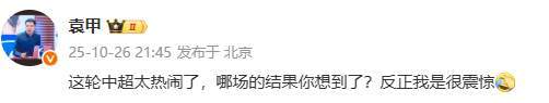 另一位著名足球记者袁甲老师则是直言震惊:“这轮中超太热闹了,哪场的结果你想到了?反正我是很震惊。”