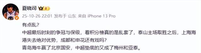 山东媒体人夏晓司老师直言有点乱:“中超最后时刻的争冠与保级,看积分榜真的是乱套了,泰山主场取胜之后,上海海港失去绝对优势,成都和申花还有戏吗?青岛海牛赢了北京国安,中超垫底的又成了梅州和亚泰。”