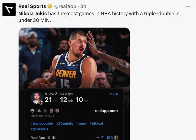 并且从三双效率方面来看,约基奇早已经反超威少,独居NBA历史第一档。近两个赛季约基奇就拿到了38次三双,其中上赛季34次,本赛季4次,各项三双数据均为同期联盟第一,同时本场也是约基奇过去两个赛季第23次在前三节就拿到三双,同样位列联盟第一。本场比赛又一次在30分钟内拿到三双,该数据表现次数遥遥领先于其他球员高居历史第一。