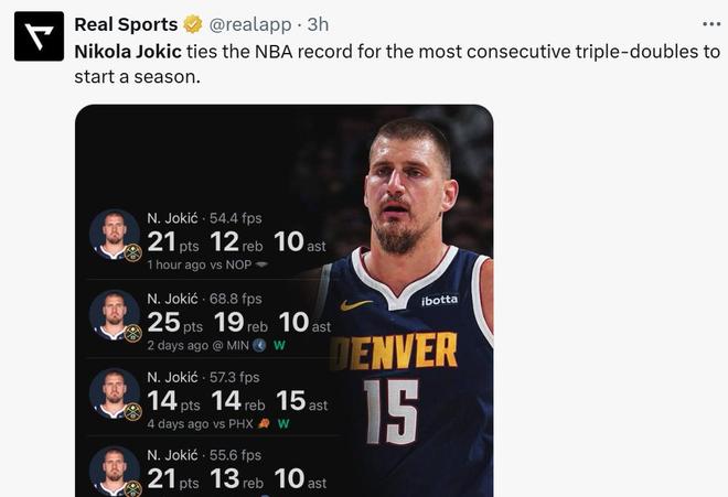 第一大利好:约基奇历史第一对于掘金队这支小球市球队来说,想要再次赢得冠军,球队核心约基奇就必须打出超神表现,好消息是开季至今,约基奇不仅延续4年3夺MVP的神奇表现,更是有继续蜕变的势头。本场对阵鹈鹕队,约基奇27分钟三节打卡拿到21+12+10三双数据,开季至今4场比赛完成三双4连击神奇表现。凭借这样的表现,约基奇追平威少与大O保持的NBA历史开季连续三双场次纪录,并列历史第一,按照约基奇的能力与状态,他下一场就有希望反超威少独占历史第一位置。