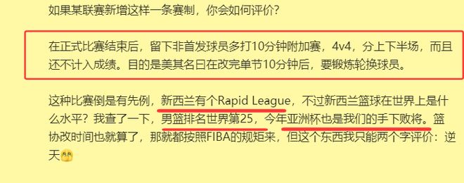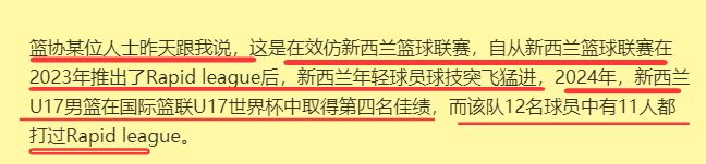 当然,CBA这种五节比赛的新玩法,其实也是有先例的,只不过之前并没有在CBA联赛出现过,但是在新西兰篮球联赛已经进行了两年时间。而CBA联赛之所以现在开始效仿新西兰篮球联赛,其真正的原因也已经曝光了。给出的理由是,自从新西兰联赛2023年开始推出单场五节比赛的玩法后,新西兰年轻球员的技术得到了突飞猛进的提升。立竿见影的效果是,新西兰U17男篮斩获2024年国际篮联U17世界杯第四名的好成绩。而参加那届世界杯的新西兰U17男篮12名球员当中,有11人都打过新西兰篮球联赛。