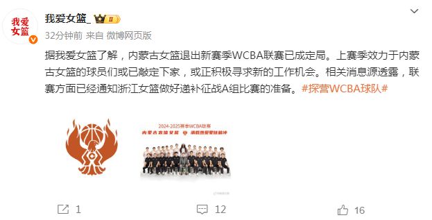 内蒙古女篮上赛季止步WCBA四强,今夏连续缺席全运会与全锦赛,处在濒临解散的边缘,种种迹象表明内蒙古女篮“要不玩了”。如今根据媒体人“我爱女篮”报道:“内蒙古女篮退出新赛季WCBA联赛已成定局。上赛季效力于内蒙古女篮的球员们或已敲定下家,或正积极寻求新的工作机会。相关消息源透露,联赛方面已经通知浙江女篮,做好递补征战A组比赛的准备。”