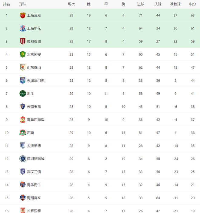 上一轮,上海申花打平大连英博,错失积分追平上海海港的机会,目前落后榜首2分,仅剩两轮必须保持全胜才有希望夺冠。最终,上海申花依靠安德烈-路易斯开场不久的头球破门,以1-0拿下关键胜利,延续争冠希望。最新积分榜如下: