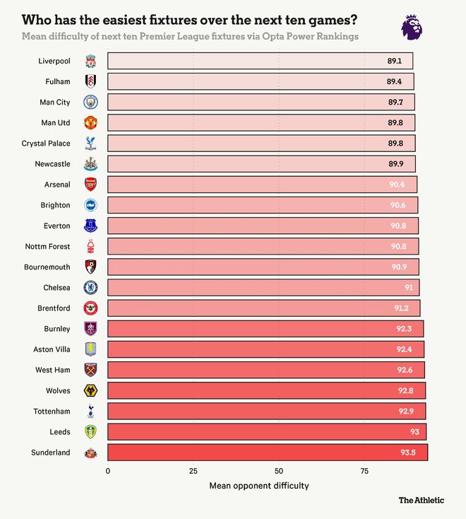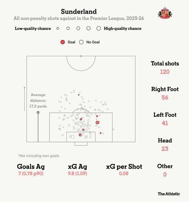 桑德兰他们几乎完成了一半的任务。长期以来,40分一直是保级球队的神圣领域,但实际上,近年来所需的分数已经有所降低。体育情报公司Twenty First Group最近的研究表明,36分就能让你更有可能保级成功。为此,桑德兰在九场顶级联赛后拿到17分——这是自二战以来他们第四次取得这样的成绩——这让他们处于非常有利的位置。在他们通过附加赛决赛获胜后,许多桑德兰球迷难以预测球队能超越哪些对手。他们已经领先三支球队12分或更多。桑德兰完成了许多升班马未能做到的事情:他们在对阵预计会挣扎的球队时表现得极为高效。西汉姆联和狼队都在主场被击败。诺丁汉森林的困境被他们抓住机会客场取胜。布伦特福德——一支表现比一些人预期更好的球队——也被击败。这为他们提供了缓冲和动力,虽然在最终积分榜上看不到,但这对整个赛季的发展有着巨大的影响。尽管充满乐观,但仍有一段漫长的路要走。降级可能会在前九场比赛中变得明显,这一点桑德兰球迷从痛苦的经历中深知,但生存不可能这么早就实现。桑德兰取得了出色的开局,但他们本赛季的主要目标仍然是保级。桑德兰虽然在联赛中被射门次数第三多,但这些射门的平均质量较低。他们的每次射门预期进球(xG)仅为0.08——仅次于阿森纳和纽卡斯尔——而平均射门距离则大约在禁区边缘。如果他们继续限制对手进行远射,他们会非常安全。
