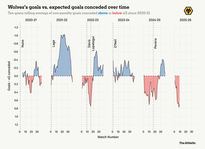 狼队在过去的三个赛季中,他们有两个赛季处于类似的位置,并且在这两种情况下都通过在一月引进球员改善阵容和更换主帅轻松保级。考虑到这一点,他们在夏季窗口通过转会费盈利并大幅削减了工资账单,因此他们应该有能力在明年一月相对自由地花钱,而一些竞争对手则会因夏季较高的净支出而受限。狼队球迷或许还能抓住一些希望,他们有几名球员——若昂-戈麦斯、安德烈和尤尔根-拉森,仅举几例——已经证明他们在英超能做得比本赛季的表现更好。狼队支持者普遍认为,他们在夏季组建的阵容根本不足以应对英超的挑战。赛季开始前加盟的六名球员没有任何英超经验,只有克雷伊奇给人留下了深刻印象,即使这位捷克后卫在最近两场比赛中的水平也有所下降。他们不再拥有克雷格-道森、勒米纳和塞梅多带来的久经考验的英超经验,也没有球员能匹配雷扬·艾特-努里和库尼亚凭借个人才华扭转比赛的能力。对狼队来说,唯一的些许鼓励是他们在九场比赛后的记录与上赛季完全相同。和那时一样,狼队基于他们所面临的高质量机会,实际丢球远远超过了预期,从11.5的预期失球中丢了19个。他们上赛季成功逆转了这一趋势,并需要再次做到这一点以自救。