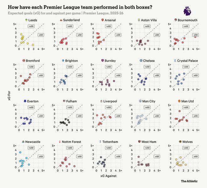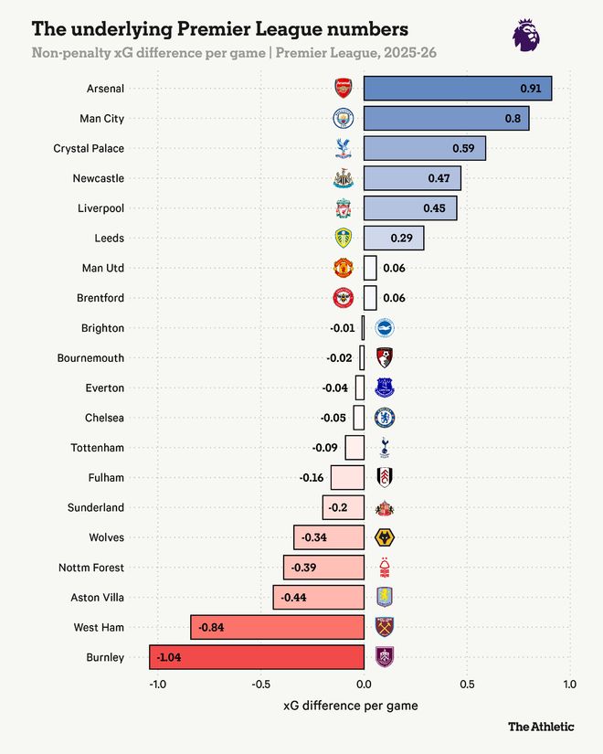 利兹联感觉利兹联已经证明了自己,这让人感到欣慰。对阵富勒姆在第94分钟因为一个乌龙球,剥夺了他们本可以争取到的0-0平局。本赛季的黑马伯恩茅斯在90分钟内被利兹联压制并最终丢掉两分。接着,本赛季开局最强的球队之一热刺在埃兰路球场侥幸带走胜利,而主队至少配得上一场平局,甚至更多。倒霉的故事只能带利兹联走到这里。他们需要的是冷冰冰的积分。他们仍然比保级所需的场均一分高出两分。潜在数据也表明利兹联的情况应该会有所改善。只有阿森纳和纽卡斯尔将对手的非点球预期进球(npxG)限制得比利兹联更低。在进攻端,利兹联的npxG排名第11位。遗憾的是,他们在两个禁区内的表现都不尽如人意。如果他们的表现回归平均水平,他们将飞速上升。足球不是靠电子表格踢的。每年,我们都会看到降级的三支球队在两个禁区内表现不佳。这很可能就是利兹联。我们每周都会谈论曼联鼓舞人心的数据,但真正让他们留在英超的是积分。他们的比赛中有一些天真之处,但归根结底,他们是否具备场上所需的质量来减少失误、守住自己的禁区并把握住另一端创造的机会?迄今为止的结果表明,机会转化是他们最大的弱点。卡尔弗特-勒温一直难以把握机会,而攻击手奥卡福尔、丹尼尔-詹姆斯和尼奥托都在他身后苦苦保持健康。球队限制对手机会的方式确实出色,但他们已经连续六场比赛未能零封。如果你想知道质量能在英超带来什么,看看曼城就知道了。他们的非点球预期失球与利兹联相同,均为8.2,但他们仅丢了六个非点球进球,而利兹联则丢了12个。这就是区别所在。利兹联的三场胜利都是对阵目前排名倒数七名的球队,但他们的潜在数据提供了很多乐观的理由。他们在平均预期进球差(xG difference)中排名第六,这反映了他们持续强劲的表现,即使结果并不总是随之而来。如果他们保持这种水平,他们有很大机会保级成功。