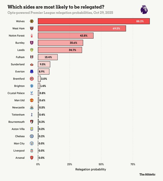 埃弗顿埃弗顿拥有一位可靠的主帅莫耶斯,自从他一月份到队后便改善了球队的命运。他们拥有优秀的门将皮克福德以及过去几个赛季帮助球队站稳脚跟的核心阵容,尽管当时进攻端稍显薄弱。在格拉利什、恩迪亚耶和迪尤斯伯里-霍尔的带领下,他们有能力在最后三分之一区域创造灵感时刻。即使是在一周前,他们出现在这份名单上肯定会引起争议。然而,0-3输给热刺,加上其他比赛结果,导致他们跌至第14位。他们最近七场比赛只赢了一场,给人一种正在朝错误方向发展的感觉。这些都不是积极的信号,但现在他们有了新的老板——弗里德金集团,他们有足够的财力在冬季窗口解决一些问题。埃弗顿本赛季初的目标是冲击欧洲赛事。虽然这个雄心壮志可能超出他们的能力范围,但如果他们陷入保级战将会令人惊讶。埃弗顿阵容在关键位置仍然短缺。虽然他们在今夏解决了一些短板,比如缺乏创造力的问题,但他们仍然缺少一名可靠的前锋。贝托和巴里总共只打进一个联赛进球,两人都未展现出应成为首发的说服力。贝托在对阵狼队时的唯一进球来自3.7的预期进球(xG),夏季签下的巴里显然仍需时间打磨。目前没有明显的解决方案,至少要等到明年一月份才可能有答案。关键后卫布兰斯韦特因接受腿筋手术预计今年不会再出场,塞内加尔双星恩迪亚耶和格耶也因非洲国家杯缺席大量比赛。替补球员将承受巨大压力。在本文提到的球队中,根据Opta的赛季长期预测,埃弗顿是最不可能降级的——降级概率仅为8.9%。这一数字低于桑德兰,尽管后者目前领先六分,埃弗顿更高的生存几率反映了他们的经验和阵容深度。