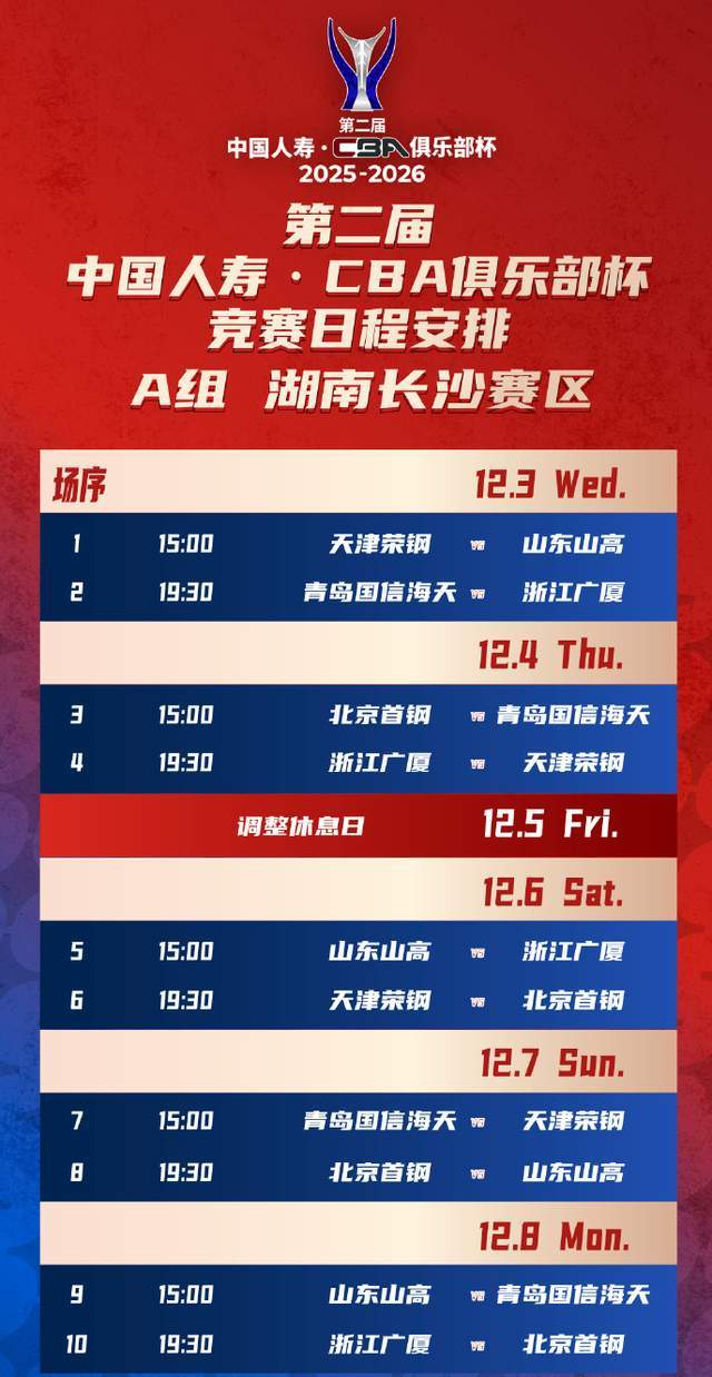 同组的广东男篮,第一场比赛在12月4日打响,对阵山西男篮。这可是一场恩怨局,杜锋和潘江,又一次遭遇,看看两队能不能迸发出新的火花吧。小组赛结束之后,第二阶段决赛阶段的比赛则将于2026年2月6日-12日在内蒙古自治区呼和浩特市进行。届时,CBA联赛已经开始了,看看谁能在联赛中期,捧起第二届俱乐部杯赛的冠军吧。相关资讯