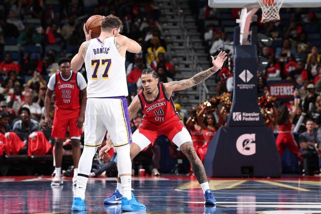 北京时间11月15日,NBA杯B组迎来了湖人与鹈鹕的较量。湖人近日惨败于雷霆,志在此役实现强势反弹。3连败的新奥尔良排名西部倒数第1,状态不佳。此役,德章泰·穆雷、普尔、锡安继续伤停,鹈鹕的首发五虎是墨菲、萨迪克贝、卢尼、琼斯与费尔斯。勒布朗詹姆斯、文森特伤停,紫金军团沿用了斯玛特、八村塁、艾顿、里夫斯、东契奇的首发阵容。双方的对决,一触即发。东契奇24+7+12创NBA历史第1神迹,艾顿11中10创纪录,湖人完胜鹈鹕!里夫斯31+7!全场比赛回顾首节开打,里夫斯外线命中,斯马特补篮得手,琼斯中距离得分还以颜色。斯马特与费尔斯对射三分球,艾顿跳投取分,墨菲强攻篮下命中,东契奇被包夹出现失误,费尔斯抢断后完成暴扣。东契奇2罚全中,里夫斯助攻艾顿上篮,东契奇被封盖,斯马特冲击内线取分,新奥尔良请求暂停。里夫斯命中2+1,艾顿补篮得分,八村塁单打取分,拉拉维亚抢断后低位打进,墨菲抛投得手,克内克特轰进三分球,湖人轰出了18比2的进攻狂潮,得以取得15分领先。鹈鹕队墨菲