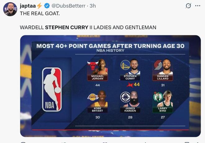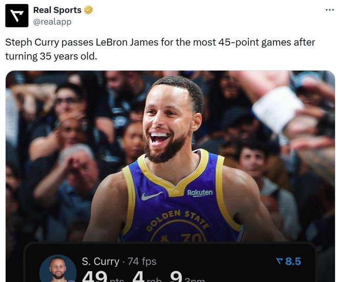 库里49分罚球绝杀在勇士109-108击败马刺的比赛中,库里延续神奇表现,全场三分17中9,爆砍赛季新高的49分,外加4篮板2助攻2抢断,更是在决胜时刻顶住压力罚球完成绝杀。凭借这样的表现,37岁的库里一战刷爆历史纪录,首先是小球王者库里30岁后已经44次单场轰下40+得分,成功追平篮球之神乔丹并列历史第一。同时本场是库里30岁后第7场轰下45+得分,超过詹姆斯的6次,独占NBA历史第一。
