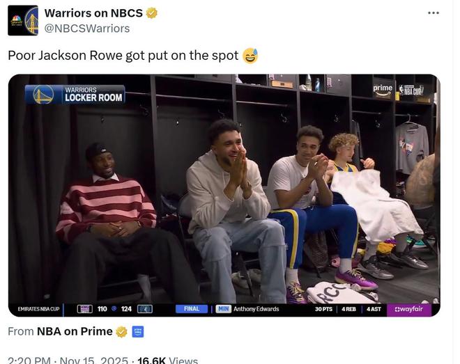 细节二:追梦暖心一幕在库里称赞全队后,另外一名老将追梦又在赛后更衣室的全美采访中送上暖心一幕。赛后科尔让追梦安排一名球员接受采访,追梦犹豫期间,科尔已经想点名近来风头正盛的理查兹,结果追梦思考了一会后选择了球队中戏份最少的杰克逊-罗,并且不忘虚晃一下先点名理查兹。突然被点名的杰克逊-罗受宠若惊,面对全美直播的镜头腼腆说道:“额,上帝保佑过库里。”