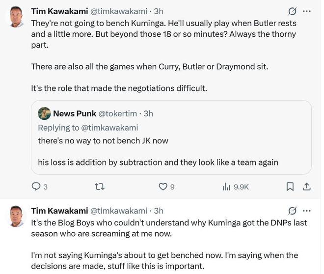 细节三:库明加不打勇士也很出色受困于伤病问题,库明加本场继续缺阵,但并不影响勇士继续交出亮眼表现。正如赛后勇士队记Tim Kawakami所说,库明加很好,但当他不在时勇士也很出色。勇士队管理层显然也意识到了这一点,相信这两场比赛会让勇士队下定一些决心。