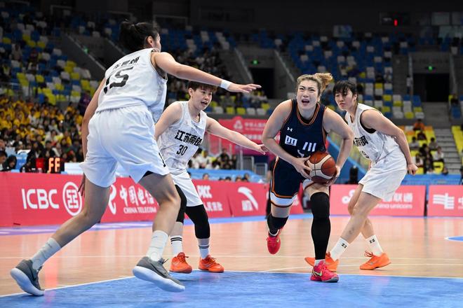 ▲四川女篮在半决赛击败江苏队(图据全运会网上新闻中心)决赛面对广东队,对四川女篮而言也是一场“复仇之战”。在上赛季WCBA总决赛中,四川远达美乐女篮以1比3不敌东莞女篮,遗憾地无缘WCBA三连冠。而此次出战全运会的四川女篮就是以四川远达美乐女篮为班底组建的,而广东女篮的班底则是东莞女篮,杨力维、杨舒予、黄思静等东莞女篮的主力也都在这支队伍中。四川女篮主教练迪萨尔·弗雷德里克在半决赛击败江苏队后,就代表球队表态说:“广东队是很强的队伍,也是上赛季WCBA冠军,明天也是一场硬战。但我们会全力以赴,在决赛中,力争在内外线都做到最好。”客场作战手感始终欠佳四川女篮遗憾失金决赛开始后,虽然贾赛琪为四川女篮先下一城,但四川女篮在第一节中的手感一直不佳,广东女篮则在全场球迷震耳欲聋的助威声中进入状态更快,并且战术执行力更强。虽然在中锋的高度上她们处于劣势,但快攻篮下却频频得手,导致四川女篮在第一节以19比26落后。第二节开始阶段,广东女篮的投篮命中率开始下降,四川女篮则稳扎稳打缩小分差,并且利用一次前场拦截为高颂制造出空位三分的机会,而高颂手起球进,将比分扳为28比28!之后,高颂再次命中三分,四川队31比30反超,本场第二次取得领先。而广东队关键时刻也是连中两个三分,双方开始打得难分难解。之后,四川女篮换上刘禹彤,“大宝贝”登场后就连续自投自抢,在连抢三个篮板后终于命中两分,并造成对手犯规获得加罚一球的机会。最后阶段双方对飙三分,上半场结束时广东队仍以43比39领先。