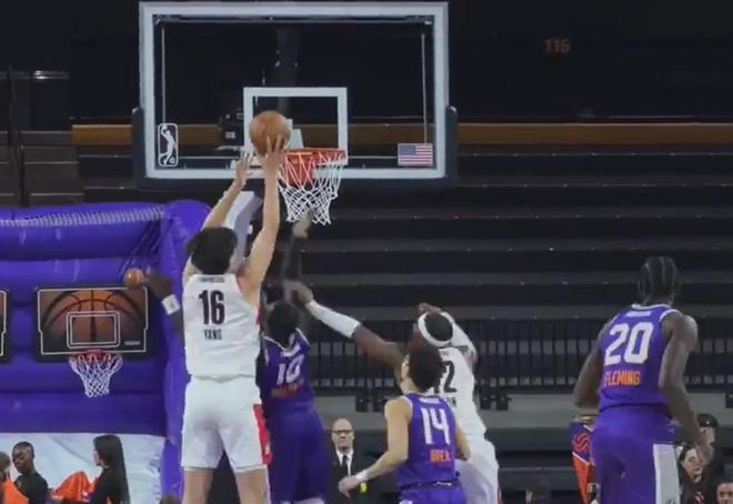 比赛一开始,混音还打了一些阵地战,杨瀚森在禁区具备一定的对抗优势。在好兄弟马卢阿奇的头上摘下前场篮板,杨瀚森补篮命中。体能还不错的时候,杨瀚森完全跟得上,甚至可以完成在弧顶的持球突破扣篮,非常潇洒。这就是开拓者想从他身上看到的东西。但随着比赛的深入,杨瀚森开始有点踉跄,大口喘气,教练对于他的使用是先打5分钟,休息几分钟,再打5分钟。不过杨瀚森一旦疲劳,运动速率就会下降明显,在两边的罚球线进行折返跑,也就是进攻下不去,防守回不来。
