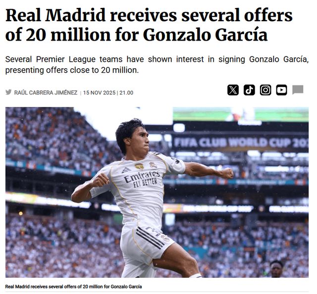 这家报纸透露,桑德兰、维拉、狼队都已经与皇马进行初步接触,愿意开出2000万欧元(1760万英镑)的报价,求购21岁的贡萨洛-加西亚。皇马正在分析研究这些报价,再做出最合适的决定。作为英超升班马的桑德兰,今年夏天就密切关注贡萨洛-加西亚,希望引进21岁的西班牙中锋,不过并未成功。凭借在世俱杯6场4球的惊艳发挥,贡萨洛-加西亚得到皇马的续约合同,续约至2030年,违约金10亿欧元。