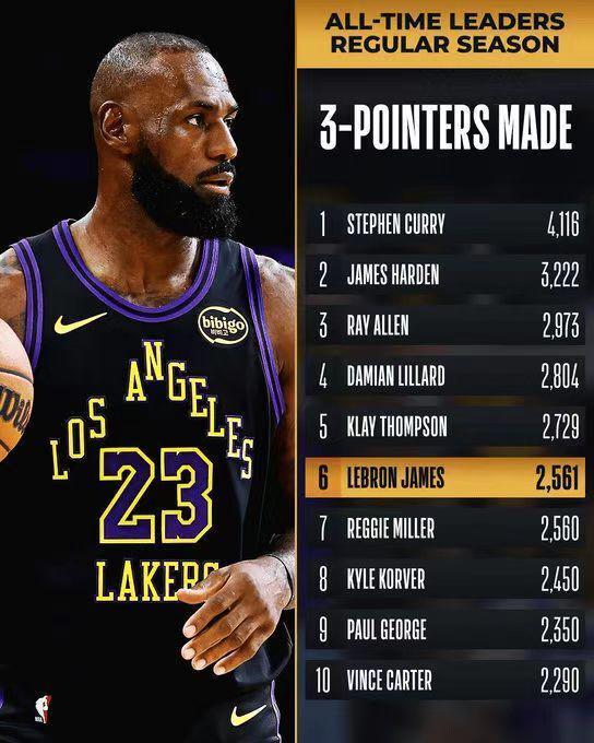 詹姆斯在次节登场9分41秒,他在场上以组织串联为主,但一度接连命中两记三分,终于打破运动战进球荒。上半场詹姆斯4中2均是命中三分,外加罚球2中1,得到7分2篮板4助攻,生涯三分命中数已经达到2561记三分,超越名宿雷吉-米勒2560记三分,升至NBA历史三分榜第6位迎来里程碑。詹姆斯在下半场状态继续提升,他第三节出场7分11秒,单节再得4分从而得分上双,让他连续得分上双历史第一纪录提升到连续1293场。