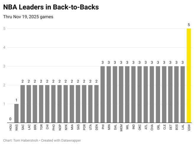 本赛季至今(截至北京时间11月20日)的赛程显示,火箭是全联盟唯一一支还没有打过背靠背比赛的球队。奇才有过一次背靠背,其他28支球队都有过至少2次背靠背,最惨的是勇士,已经打了5次背靠背。