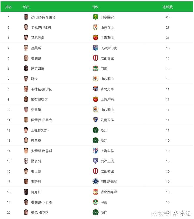 中超金靴争夺非常激烈,末轮法比奥上演大四喜,卡扎伊什维利梅开二度。最终,法比奥以28球夺得中超金靴,卡扎伊什维利无奈与金靴擦肩而过。此外,本土球员王钰栋11球第一,韦世豪10球排名第二,吴曦、谭龙各自打进9球。相关资讯