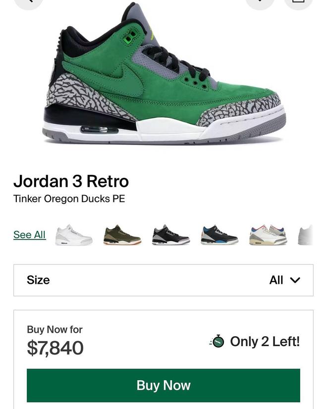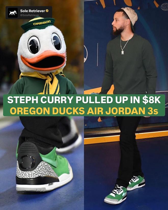 据美国球鞋媒体soleretriever报道,库里在昨日入场时上脚了超级罕见的AJ3俄勒冈大学配色,而这双鞋是AJ为俄勒冈大学设计的专属款(NIKE总部位于俄勒冈州),仅为俄勒冈大学篮球队提供,发布后并没有进行市售。很多未市售鞋款是品牌为签约运动员、合作院校打造的PE(球员专属)鞋或定制款。比如Jordan Brand曾为特雷-杨、塔图姆等签约球星定制过未市售的AJ正代系列PE鞋,耐克曾给康涅狄格大学、俄勒冈大学篮球队设计专属配色球鞋。这些鞋本仅供球员穿着或院校使用,但部分会通过球员私下转让、团队内部人员转卖等方式流入二级市场。据美媒报道,库里上脚的这双AJ3俄勒冈大学PE,传闻货量仅500-1000双,所以流出后迅速成为二级市场焦点,目前价格在8000美元左右。