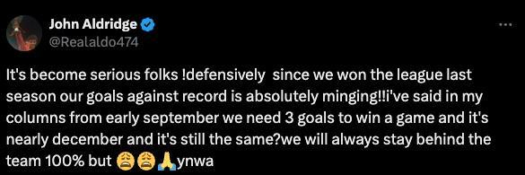 约翰-奥尔德里奇表示:“事情已经变得严重了,各位!自从我们上赛季赢得联赛冠军以来,从防守的角度看,我们的丢球纪录绝对糟糕!”他提到,如今利物浦在联赛中已经丢了20球,这是球队眼下面临的最大问题。他表示:“我从9月初写专栏开始就说,我们需要打进3个球才能赢下一场比赛,而现在都快12月了还是一样吗?我们永远都会百分之百支持这支球队,但是……”随后他用了好几个无奈的表情符号来表达自己的情绪。