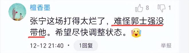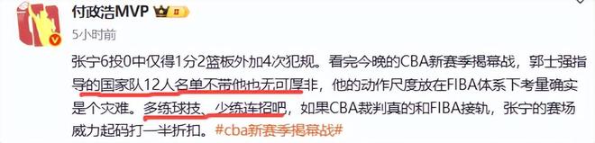 赛后付政浩发文称,郭士强指导的国家队12人名单不带他也无可厚非,他的动作尺度放在FIBA体系下考量确实是个灾难。多练球技、少练连招吧,如果CBA裁判真的和FIBA接轨,张宁的赛场威力起码打一半折扣。山西球迷接受不了这一评价,“仅凭一场比赛就能得出这样的结论吗?有点武断了吧。”付政浩正色道:这还武断?看了他四个赛季了,动作一年比一年离谱。其实完全可以去跨界UFC试试。