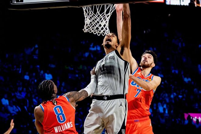 所以,两队的分差被迅速缩小,只剩4分。雷霆队能做的,似乎只有用防守反击得分,阵地战根本没有任何机会。而随着文班亚马在进攻端找回手感,这支完全体的马刺队,开始向雷霆队这支看起来无法战胜的高峰发起冲击。随着文班亚马迎着哈滕大号三分干拔命中,半场结束前,马刺队将分差追至3分。易边再战,福克斯反击上篮得手,成功完成反超。从一度落后16分到反超,这一波逆转给足了马刺队信心。在这之后,马刺队一直稳住比分。不得不说,雷霆这样年轻的冠军球队,看起来确实只有马刺这样同样年轻,也同样有竞争力的球队才能对其造成威胁。