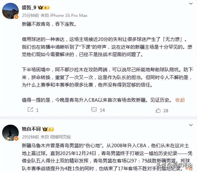 媒体人“盛哲”发文点评:“这场主场接近20分的失利让很多球迷产生了「无力感」。我们也在转播中清晰听到了“下课”的呼声,这在近年的新疆主场是十分罕见的。感觉他们现如今需要解决的,已经不是技战术层面的问题了。下半场困境中,阿不都沙拉木在攻防两端,可以说尽己所能地帮助球队爬坑。防下来,拼命转换,重复了一次又一次,这是作为队长的担当。但同时令人不解的是,为什么上赛季和本赛季的很多比赛,他并没有得到足够的信任。今晚是青岛升入CBA以来首次客场击败新疆。见证历史。”新疆男篮目前遇到什么情况?