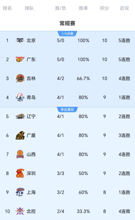 从以上积分榜来看,联盟只有北京队、广东队开局五连胜,吉林队多赛一轮4胜2负升入第三,青岛队、辽宁队、广厦队、山西队都是4胜1负的战绩。此外,全败球队仅剩天津队、四川队。从开局表现来看,吉林队、青岛队、北控队、新疆队的表现最为意外,前面两队不断往上走,后面两队不断往下走。相关资讯