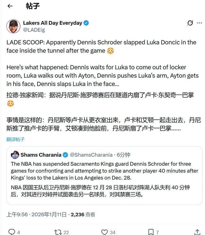 小道消息,据知名湖人自媒体LADE的报道(上图两人在罚球线附近的垃圾话对喷就是拍摄于这位老哥):施罗德赛后给了东契奇一巴掌,当时施罗德在更衣室门口等东契奇出来,东契奇和艾顿一起走出来,施罗德推了东契奇的手臂,艾顿凑到他的身前,然后施罗德扇了东契奇一巴掌。